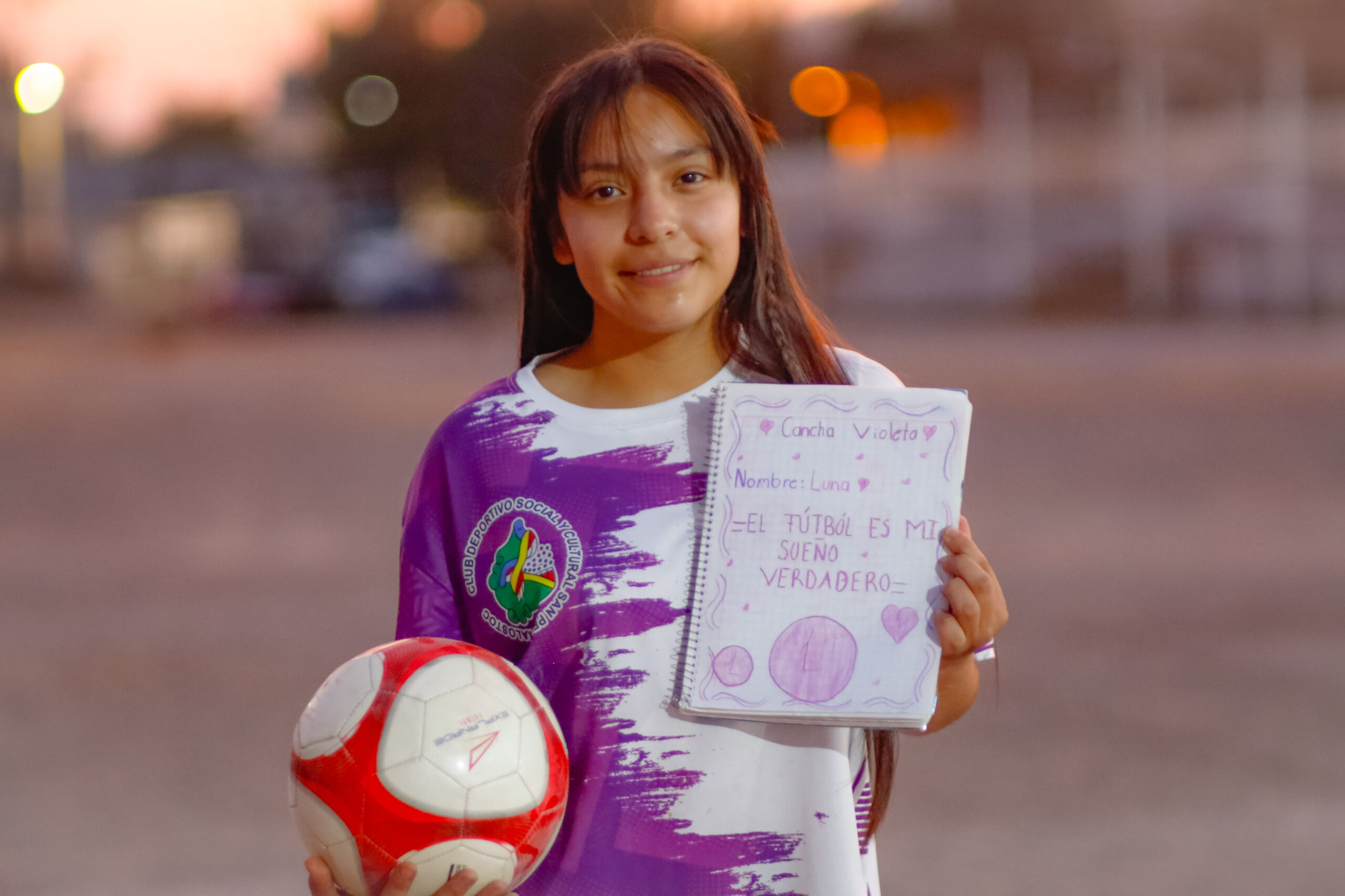 “Me gusta muchísimo el fútbol, para mí lo es todo. Cuando estoy en mi cancha, cuando estoy con mi familia violeta, esto significa mucho para mí, porque aquí hay valores, hay respeto, hay libertad. Hay demasiadas cosas, muchas oportunidades para una niña de trece años como yo. Me gusta compartir muchísimo mi tiempo con mis compañeros, jugando fútbol, estar con el balón en pie. Es increíble estar aquí”, cuenta Luna, niña futbolista en Ecatepec.