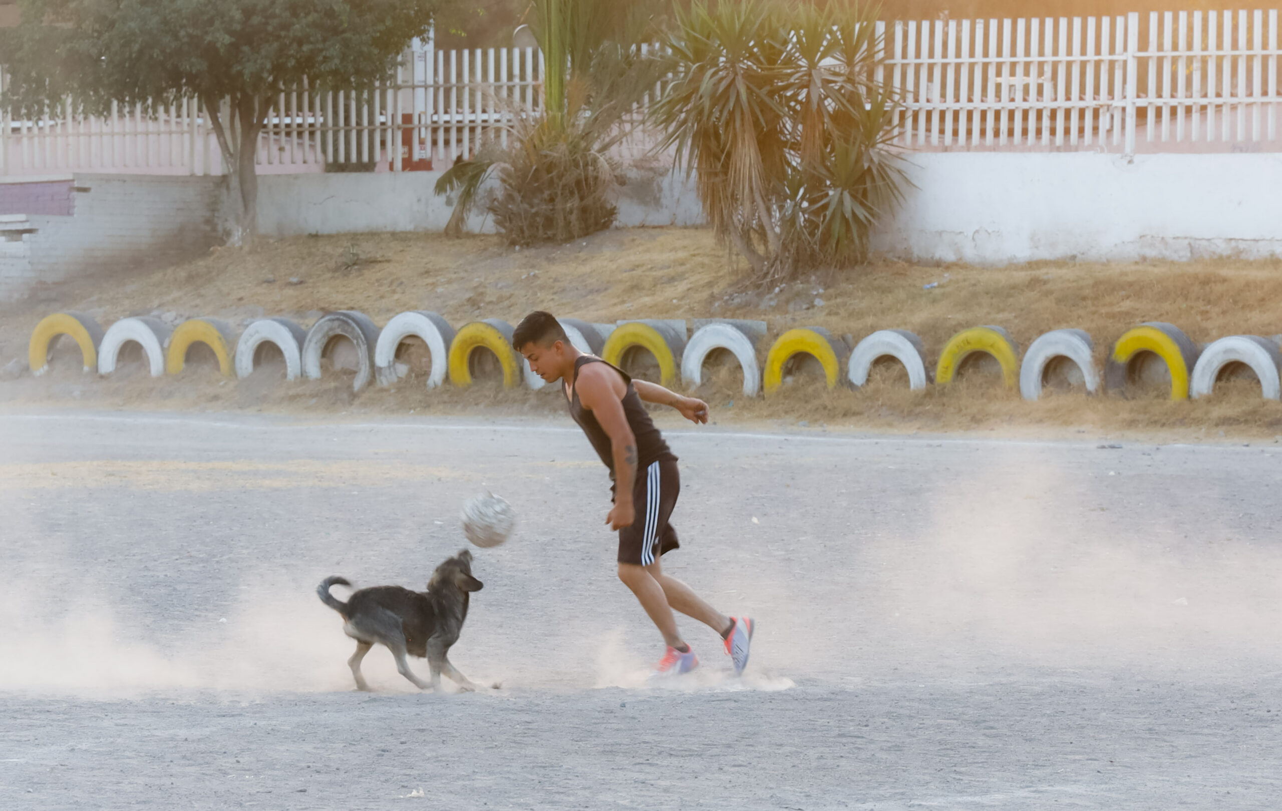 En medio de la cancha llanera se observa un niño jugando con su perro y una pelota, mientras en la cancha de futbol rápido unos niños y niñas, junto a sus padres y madres, festejan el segundo aniversario de la Cancha Violeta.