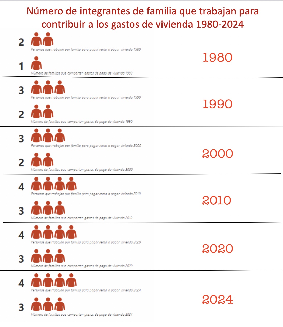 El encarecimiento volcó a más cantidad de población a buscar una vivienda subisdiada o de interés social, popular, y a otro sector, a compartir gastos, vivir con otras familias y a hacinarse. Lozano explicó que ésta es la verdadera característica de este proceso, el hacinamiento que tiene a 36 millones de mexicanos viviendo en espacios menores del que necesitan. La disminución del tamaño de las familias también impactó en su capacidad para costear el gasto en vivienda, como muestra la gráfica realizada por el CAM para este reportaje.