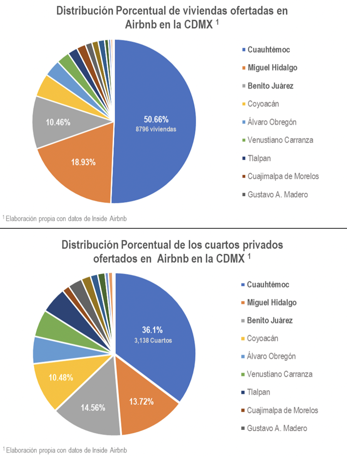 Las gráficas elaboradas por HIC, que reproducimos en este reportaje, muestran la predominancia territorial de la oferta de renta temporal en Airbnb en cuatro alcaldías —Cuauhtémoc, Miguel Hidalgo, Benito Juárez y Coyoacán—, las cuales concentran el 84.62 por ciento de la ciudad, que ronda las 26 mil unidades en total.
