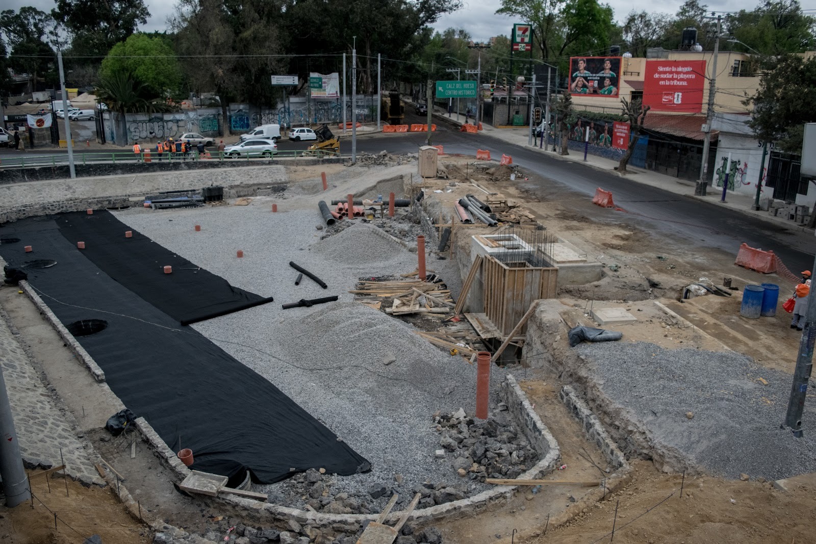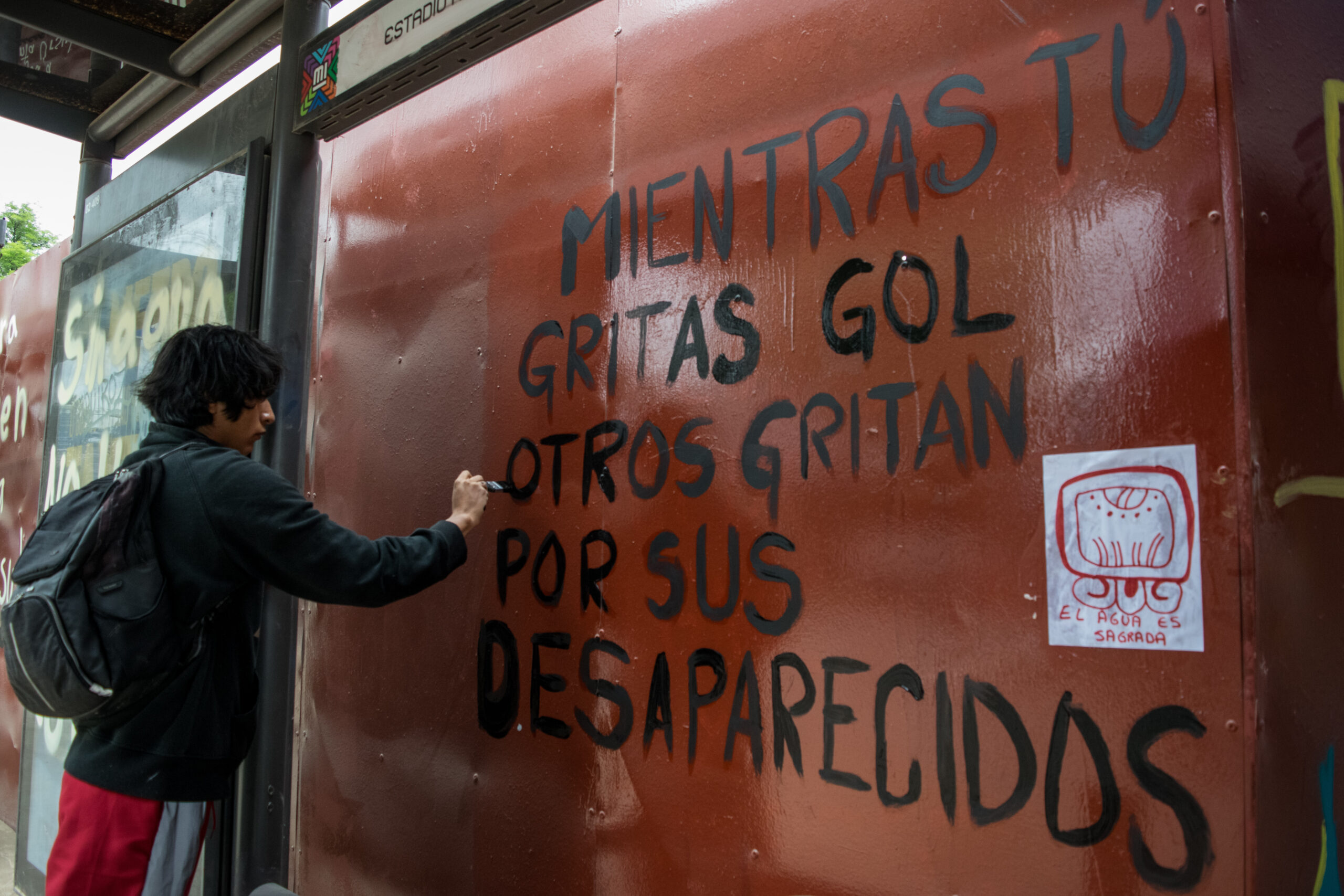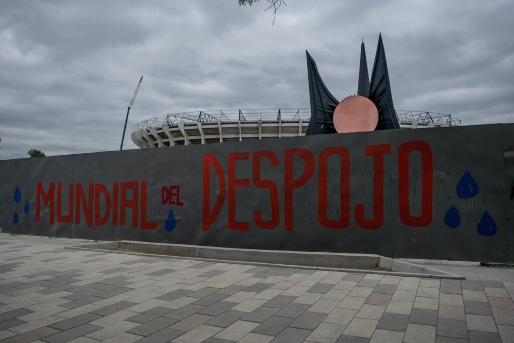 El rechazo de estas vecinas y vecinos al Mundial de Fútbol, junto a la denuncia de múltiples problemáticas relacionadas a este evento como el desabasto de agua, la turistificación y la gentrificación en colonias aledañas al Coloso de Santa Úrsula, quedó plasmado en intervenciones gráficas realizadas en vallas publicitarias y columnas del bajopuente, ante una posible visita de Brugada a las inmediaciones de este espacio en disputa.
