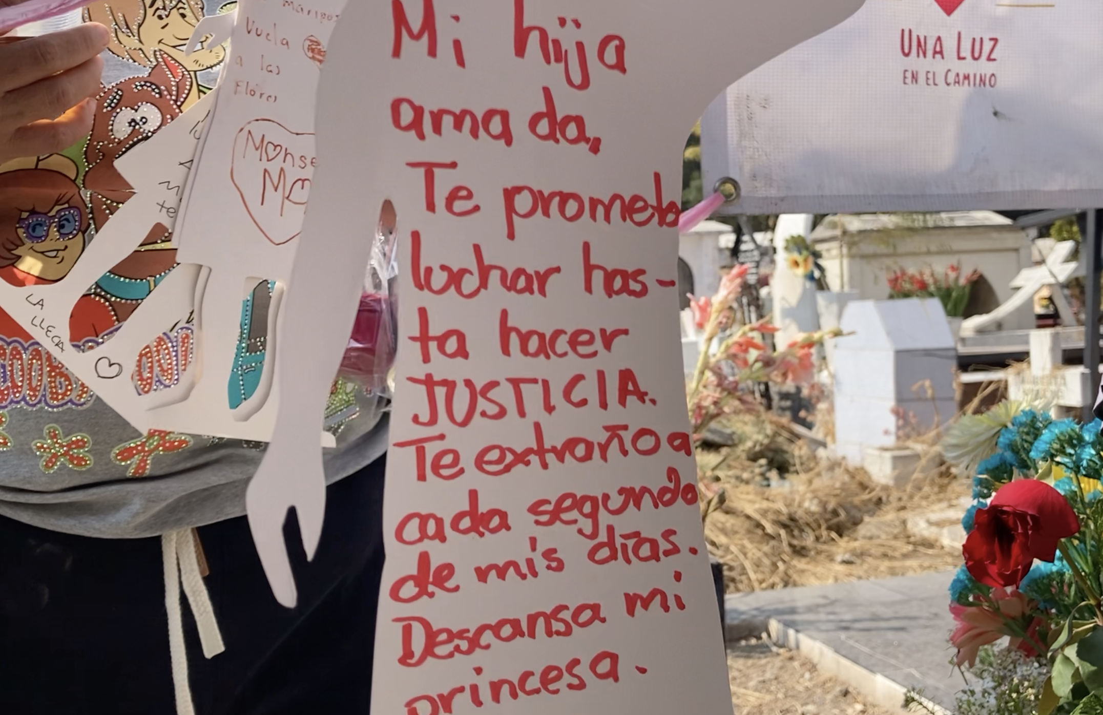 Mientras las familias y solidarias presentes durante la ceremonia del primer aniversario luctuoso de Monse decoraban su tumba, y colgaban mensajes de amor y espeanza escritos en siluetas recortadas en papel de Justicia —la imagen que corona la Glorieta de las Mujeres que Luchan—, Jaqueline señaló el sinsentido de que México sea sede de una nueva copa de fútbol este año.